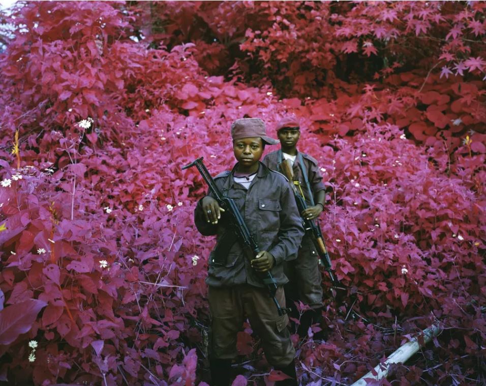 ریچارد ماس، عکاس و فیلمساز ایرلندی، رنگهای شاداب را به شیوهای اغلب ناراحتکننده در آثارش به کار میگیرد. ماس با استفاده از فیلم مادون قرمز برای مجموعهی «اینفرا» (2011-2010)، که بر جنگ بین ارتش کنگو و شورشیان تمرکز دارد، شاخ و برگ سبز و قهوهای زمین را به صورتی و قرمز روشن تبدیل میکند. مردان و زنان مسلحی که با لباس نظامی در برابر درختان آب نباتی رنگ قرار گرفتهاند. تصاویر ماس منظرهای ماورایی را نشان میدهد که از درگیریهای انسانی احاطه شده است.